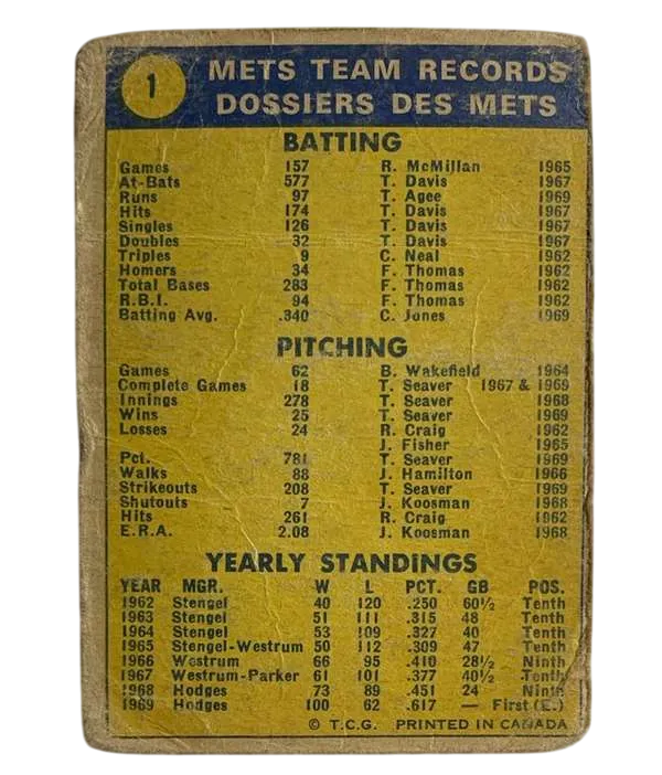 Celebrate a monumental moment in baseball history with the 1970 O-Pee-Chee #1 New York Mets World Series Champions card. This original piece of sports memorabilia hails from Canada and features the iconic New York Mets team during their celebrated post-World War II era. It's a standard-sized treasure that captures the essence of the 1970 MLB season and the culmination of a remarkable journey to become World Champs.