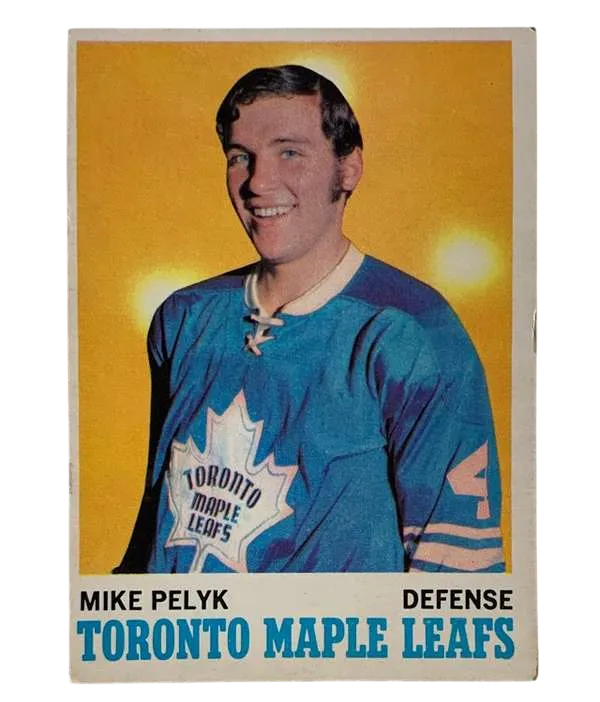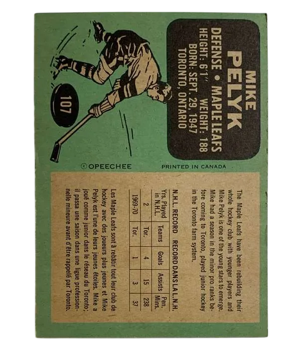 Delve into the history of hockey with the 1970-71 O-Pee-Chee card featuring Mike Pelyk, a cherished piece for any collector. As a rookie card, it captures the beginning of Pelyk's career with the Toronto Maple Leafs, a notable entry for fans of the sport or collectors looking to commemorate the player's early days. This card, numbered 107, is part of the iconic 1970-71 O-Pee-Chee set, known for its detailed photography and classic design.A must-have for those who appreciate the legacy of ice hockey and the National Hockey League, it's a tangible slice of sports history that celebrates the game's rich heritage and a star from the Maple Leafs' storied lineup.