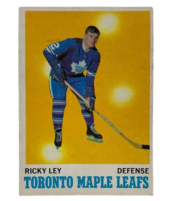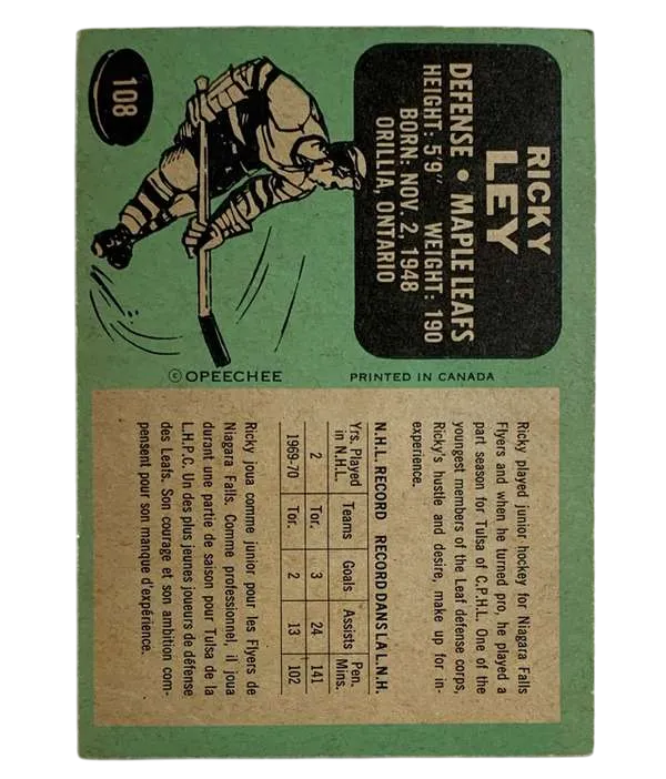 Capture a piece of hockey history with the #108 Rick Ley 1970-71 O-Pee-Chee hockey card. This vintage collectible features Ley, an integral player for the Toronto Maple Leafs during the 1970 NHL season, making it a must-have for fans and collectors alike. The card measures the standard 3½" x 2½" and hails from the revered Base Set of the O-Pee-Chee series.Proudly displaying its authenticity as an original release from the 1970s, this card has not been autographed, preserving its classic charm. It is a quintessential piece of sports memorabilia that celebrates the legacy of the National Hockey League and the storied Maple Leafs team.