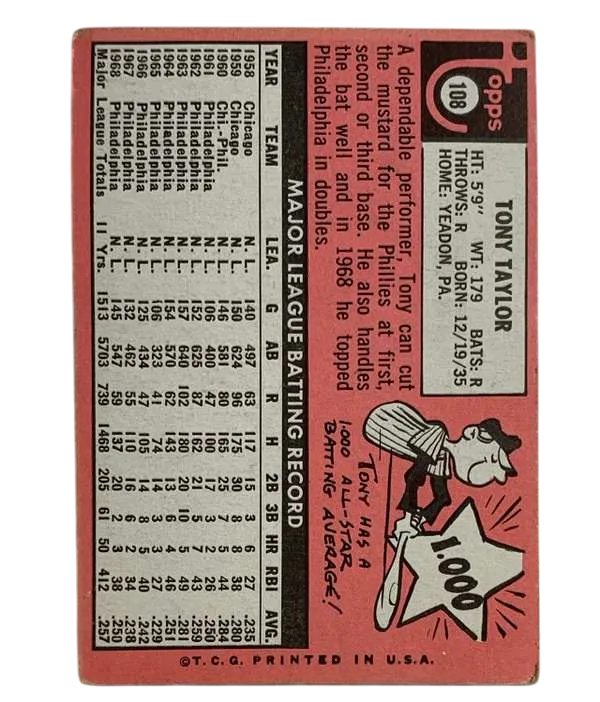 Delve into the nostalgia of baseball with the #108 Tony Taylor 1969 Topps sports trading card. A true vintage piece for collectors and enthusiasts, this card captures the essence of the era and celebrates the career of the notable player Tony Taylor. Crafted by Topps, a trusted name in sports memorabilia, this card is a part of the iconic 1969 Topps set, renowned for its classic design and collectibility.A must-have for those who appreciate the history and tradition of baseball, it is a timeless piece that embodies the spirit of the sport.
