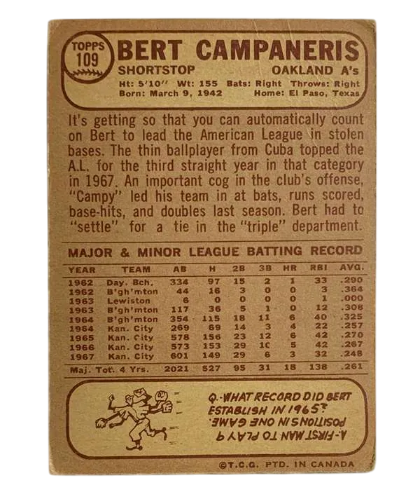 Own a piece of Oakland Athletics history with this 1968 O-Pee-Chee Bert Campaneris #109 baseball card, now available at Alex Collect. Bert 'Campy' Campaneris was a cornerstone of the legendary A's dynasty, known for his incredible speed and defensive mastery at shortstop. This card captures him during the franchise's transition to Oakland, featuring the iconic burlap-border design that defines the 1968 set.
