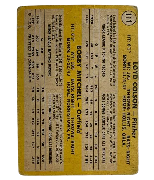 Delve into the history of baseball with this 1971 Topps Sports Trading Card featuring the rookie stars of the New York Yankees, Ed Colson and Bobby Mitchell. Card #111 from the set captures the early careers of these Major League legends, manufactured in Canada during the year that Mitchell made his mark on the sport. The card, a true piece of sports memorabilia, is an original release from the Topps collection and showcases the iconic design that collectors and fans alike have come to love.It's a must-have for any serious baseball card enthusiast or fan of the game, commemorating the legacy of two players who left an indelible mark on the sport's rich history.