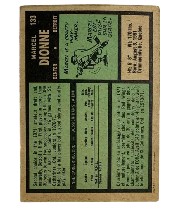 Capture a piece of hockey history with the #133 Marcel Dionne Rookie Card from the 1971-72 O-Pee-Chee set. This vintage card celebrates the legendary right winger's debut season with the Detroit Red Wings, showcasing the beginning of a storied career in the National Hockey League. As an original issue, this card holds authenticity and nostalgia for collectors and fans alike.Expertly manufactured by O-Pee-Chee, the card features standard dimensions and the iconic OPC parallel/variety. It's a must-have for those who appreciate the rich heritage of ice hockey and seek to own a tangible part of the sport's legacy. Whether for your personal collection or as a thoughtful gift, this rookie card is a timeless piece of sports memorabilia.