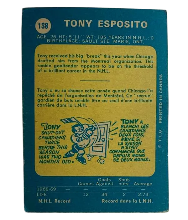 #138 Tony Esposito (Rookie Card) Excellent 1969-70 O-Pee-Chee