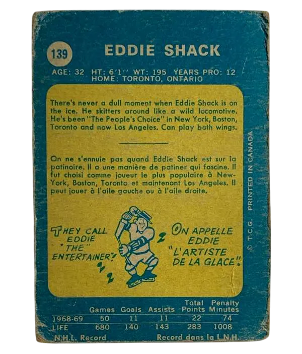 Crafted in Canada during the grips of the National Hockey League's 1969 season, this card captures the essence of the sport in its purest form. It's a tangible piece of the ice hockey legacy, connecting enthusiasts to the golden era of the game and the players who skated through it, including the tenacious Eddie Shack.