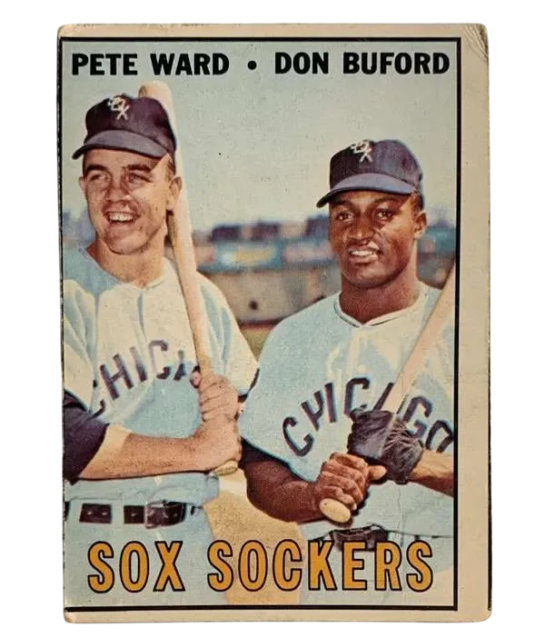 Delve into the nostalgia of America's pastime with the #143 Sox Sockers card from the 1967 Topps Baseball set. Featuring Chicago White Sox power hitters Pete Ward and Don Buford, this card captures the essence of the era and is a must-have for any serious collector. The card, a product of Topps – a name synonymous with quality and history – is a tangible piece of baseball legacy. Adding to its collectibility, this particular card is a rare miscut variant, setting it apart from the standard issue.Whether you're a fan of the sport, a dedicated collector of sports memorabilia, or simply appreciative of vintage aesthetics, this card is an excellent addition to any collection. It represents not just a game, but a slice of baseball history.