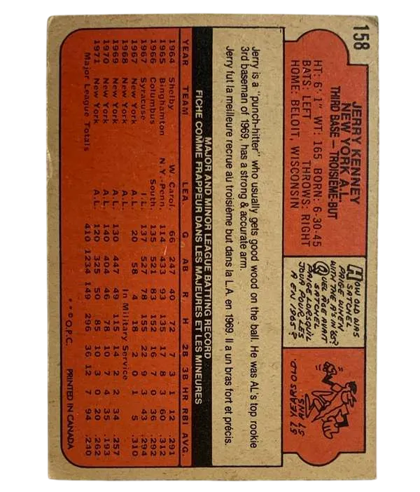 Step back in time with this authentic 1972 O-Pee-Chee baseball card featuring Jerry Kenney of the New York Yankees. Card number 158 from the set captures the essence of the era and celebrates Kenney's contribution to the sport during the 1972 MLB season. Crafted in Canada, this original piece is a must-have for vintage card collectors and baseball enthusiasts alike. With its classic design and historical significance, the card serves as a tangible piece of baseball history.Whether you're adding to your collection or starting a new one, this Jerry Kenney card is a noteworthy acquisition that commemorates the rich legacy of the game.