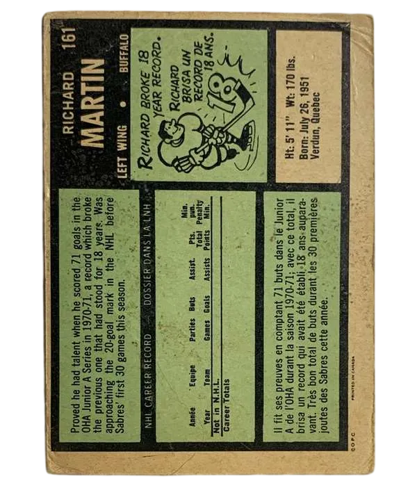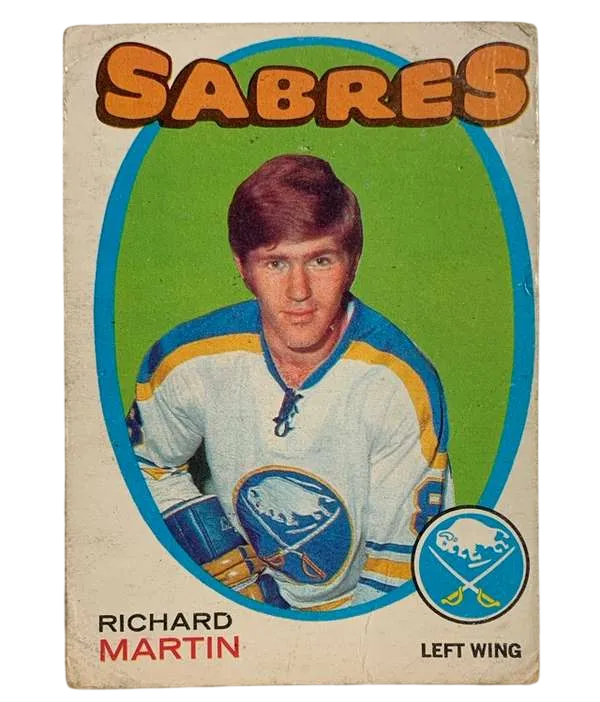 Discover a piece of hockey history with the #161 Richard Martin Rookie Card from the 1971-72 O-Pee-Chee set. This treasured collectible features the early career of Richard Martin, a notable player for the Buffalo Sabres during the National Hockey League's vibrant 1970s era. Crafted by O-Pee-Chee, a brand synonymous with quality and authenticity in the sports trading card industry, this card is a must-have for enthusiasts and collectors.The card's features highlight its rookie status, capturing a moment from Martin's inaugural NHL season. Add this iconic card to your collection and own a snapshot of ice hockey legacy.