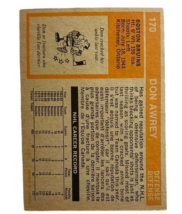 Relive the glory days of ice hockey with this authentic 1972-73 O-Pee-Chee sports trading card featuring the formidable Don Awrey of the Boston Bruins. A treasured piece for any collector, this card captures the essence of the National Hockey League during a seminal season, and is a tribute to the enduring spirit of the sport. Crafted with care in Canada, this piece of hockey memorabilia is a direct link to the past, showcasing the craftsmanship of an era when cards were a tangible connection to the players and the game.