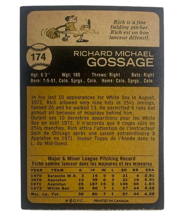 Step back in time with this #174 Rich Gossage rookie card from the 1973 O-Pee-Chee Baseball Card set. A treasured piece for any collector, this card features the legendary pitcher during his inaugural season with the Chicago White Sox. As a genuine piece of baseball history, it's a must-have for enthusiasts of the sport and collectors alike. Crafted in Canada, the card is a classic representation of the era with its standard size and card stock material.