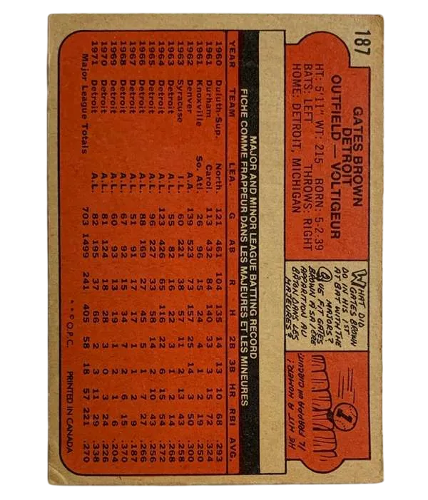 Capture a slice of baseball history with the #187 Gates Brown 1972 O-Pee-Chee Baseball Card. This vintage collectible features Gates Brown, the celebrated Detroit Tigers player, and is a must-have for fans and collectors alike. The card is from the 1972 O-Pee-Chee set, known for its detailed photography and classic design. Crafted in Canada, this original piece of sports memorabilia is a testament to Brown's legacy in Major League Baseball.
