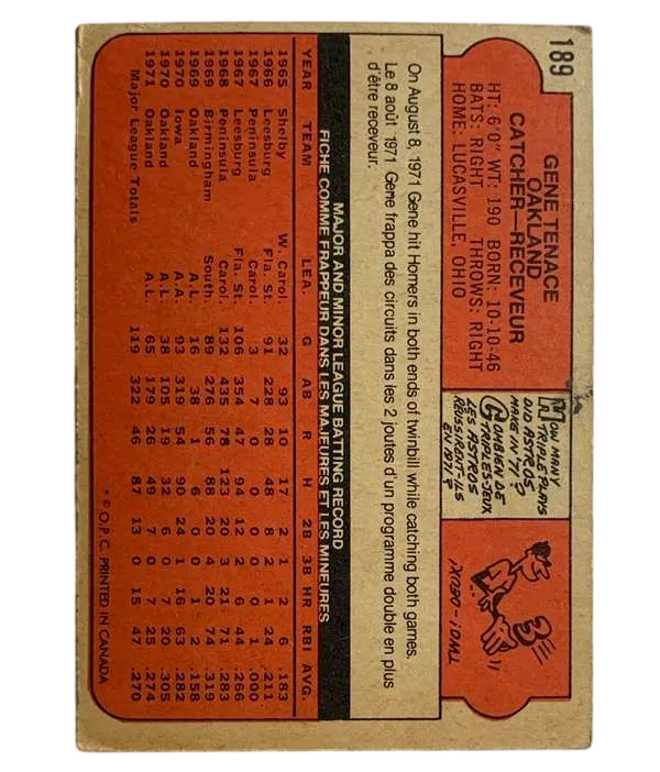 Delve into the world of vintage baseball collectibles with the #189 Gene Tenace 1972 O-Pee-Chee Baseball Card. This original card features the formidable Oakland Athletics player, capturing the essence of his rookie season. A treasured piece for any baseball aficionado, it's a classic token from the 1972 Major League Baseball season.