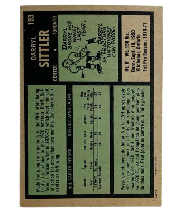 Secure this iconic piece of Toronto Maple Leafs history! This 1971-72 O-Pee-Chee Darryl Sittler #193 card is a must-have for any serious vintage hockey collector. As Sittler’s second-year card, it captures the legendary Hall of Famer just as his career was taking flight. Sittler, a 1989 Hockey Hall of Fame inductee, remains one of the most beloved figures in Leafs history, famously holding the NHL record for most points in a single game (10). This card is a tangible link to that golden era of Toronto hockey.
