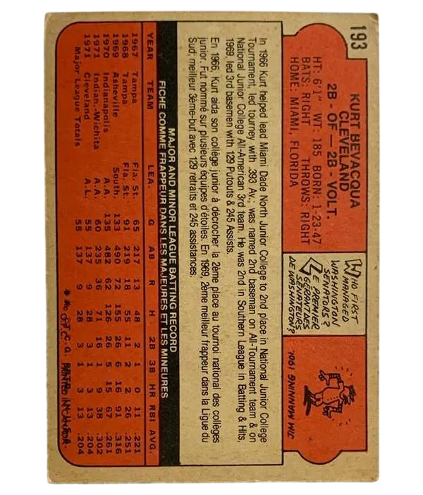#193 Kurt Bevacqua Rookie Card 1972 O-Pee-Chee