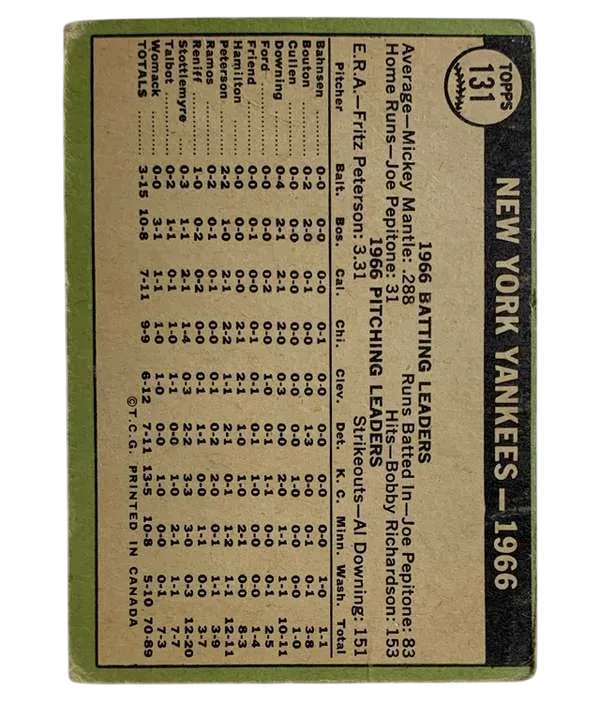 Delve into the history of baseball with the #131 New York Yankees 1967 O-Pee-Chee Baseball Card. A treasured piece from the 1967 O-Pee-Chee set, this card captures the essence of the era and celebrates one of MLB's most iconic teams. Manufactured in Canada, this original card is a must-have for collectors and fans alike, offering a glimpse into the sport's rich past. With its standard card size, this piece fits seamlessly into any collection, while its vintage status adds a layer of prestige and nostalgia. Celebrate the 1967 season and the legacy of the New York Yankees with this classic sports trading card, a timeless addition to your memorabilia.