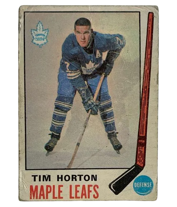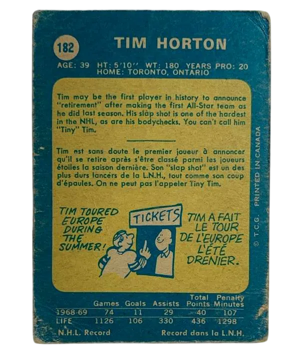 Step into hockey history with this 1969-70 O-Pee-Chee Tim Horton #182, a must‑own vintage card featuring one of the most iconic defensemen ever to wear the Toronto Maple Leafs sweater. Tim Horton isn’t just a Hall of Fame blueliner — he’s a Canadian cultural legend whose legacy extends far beyond the rink. For collectors of classic OPC hockey, this card delivers the unmistakable charm of late‑60s printing, bold colors, and the bilingual Canadian back that defines the era. This card showcases Horton in his classic Maple Leafs uniform, captured in a strong defensive stance that reflects the physical, reliable style he was known for. The front design includes the Maple Leafs crest, a clean portrait-style pose, and the vintage OPC layout collectors love. The back provides a bilingual English/French write‑up, complete with stats from the 1968‑69 season and a cartoon vignette — a signature feature of O-Pee-Chee’s golden years. Tim Horton entered the 1969-70 season as a 20‑year NHL veteran, known for his punishing slap shot, heavy bodychecks, and unmatched consistency. His career totals printed on the card highlight his longevity: over 1,100 games played, more than 400 career points, and nearly 1,300 penalty minutes. Few defensemen of his era combined toughness, skill, and leadership the way Horton did.
