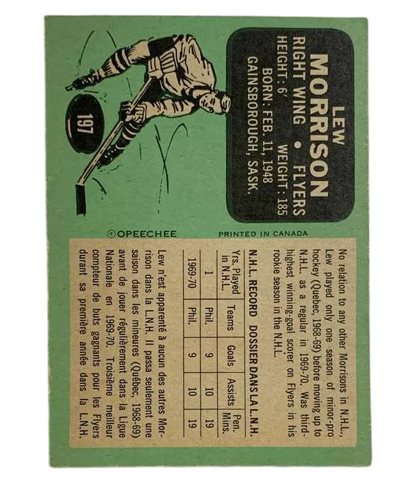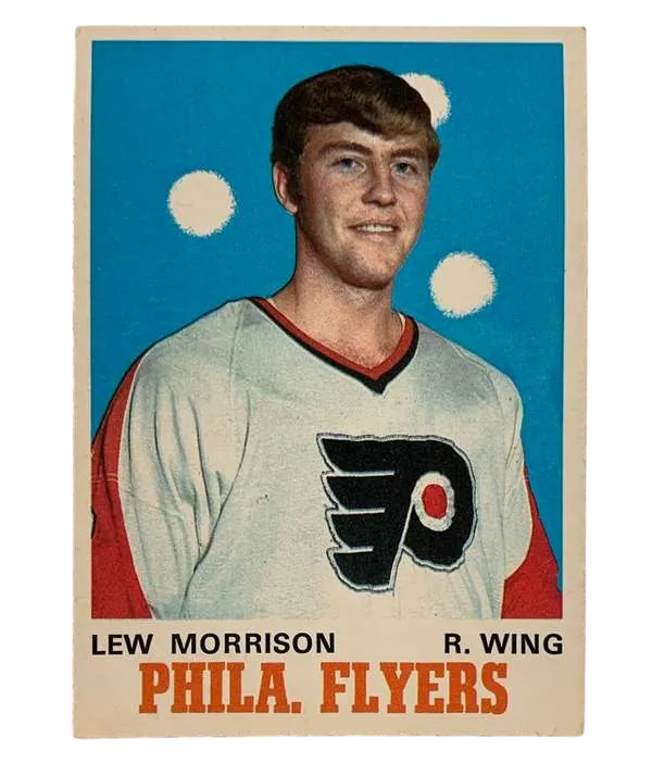 Delve into the history of hockey with this #197 Lew Morrison rookie card from the 1970-71 O-Pee-Chee set. Celebrate an iconic era in the NHL with this original piece of memorabilia featuring the Philadelphia Flyers' notable player. Crafted from durable card stock, this vintage card is a testament to the timeless appeal of ice hockey and its storied past. As a cherished collectible, this card is a must-have for enthusiasts and fans of the sport. It's presented in English and retains its classic appeal with its standard card size. A true gem for collectors of sports trading cards, this piece connects you to the legacy of Lew Morrison and the excitement of the 1970-71 ice hockey season.