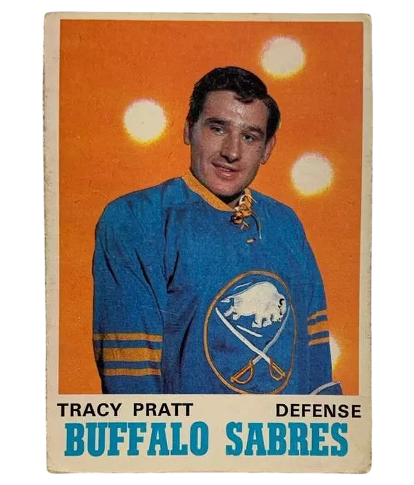 Step back into NHL history with this 1970-71 O-Pee-Chee Tracy Pratt hockey card (#146). This card is a must-have for Buffalo Sabres fans and vintage hockey enthusiasts alike, as it represents the Sabres' very first year in the league following the 1970 expansion. Tracy Pratt, a rugged defenseman and son of Hall of Famer Babe Pratt, was a key physical presence on that inaugural Buffalo roster.