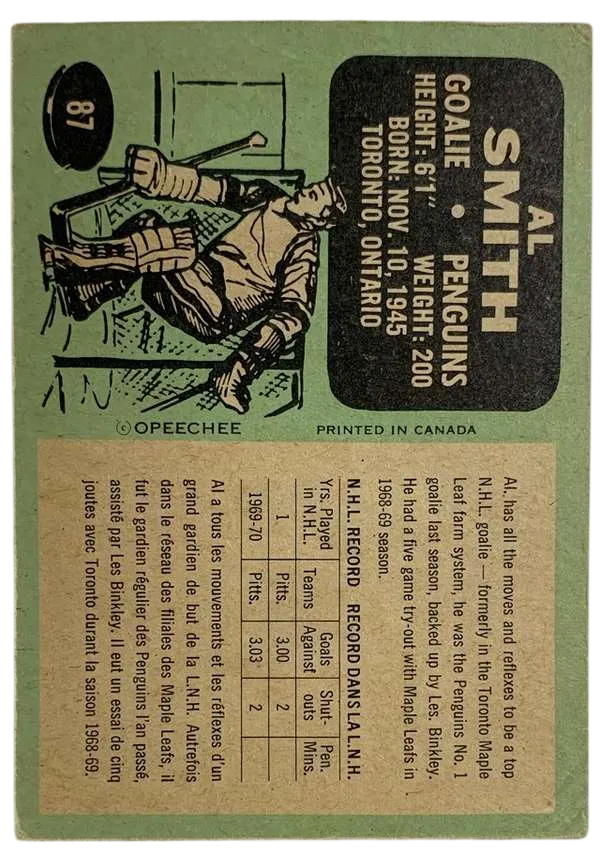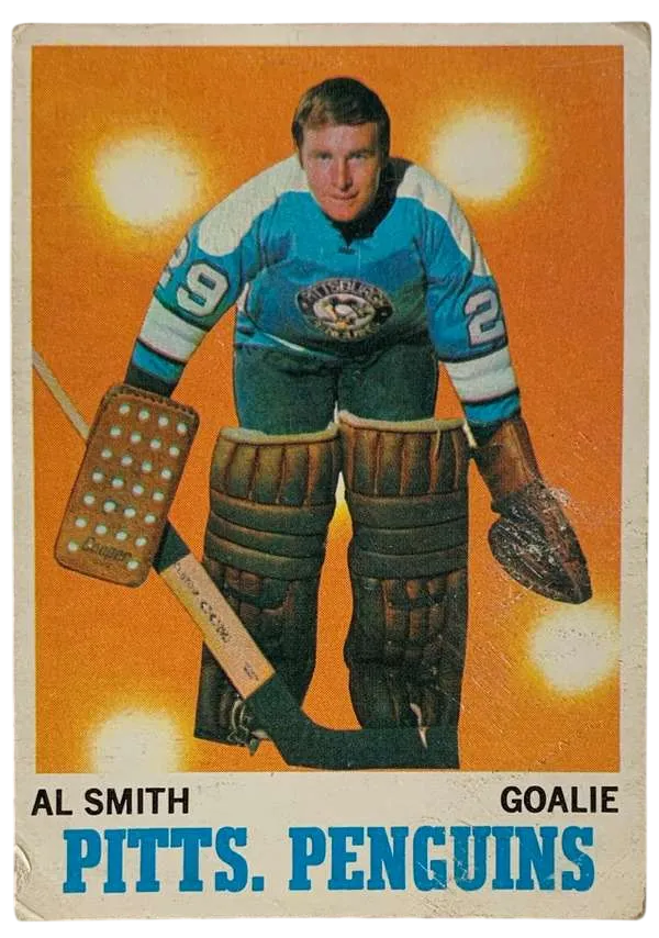 Al Smith was more than just a netminder; he was a character of the game. Known for his "Suitcase" nickname due to his many stops across the NHL and WHA, Smith found a true home in Pittsburgh during the late 60s and early 70s. This card commemorates his breakout 1969-70 season where he established himself as a reliable NHL starter. For fans of the Pittsburgh Penguins, this card represents the foundation of the franchise.