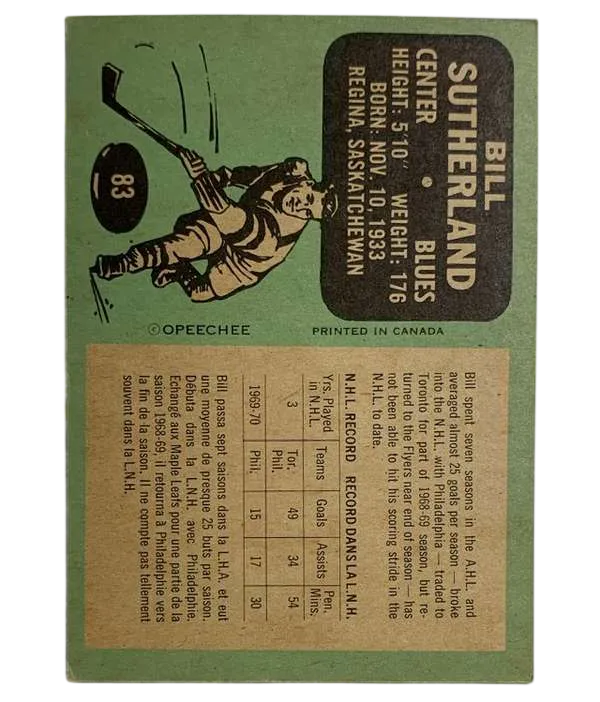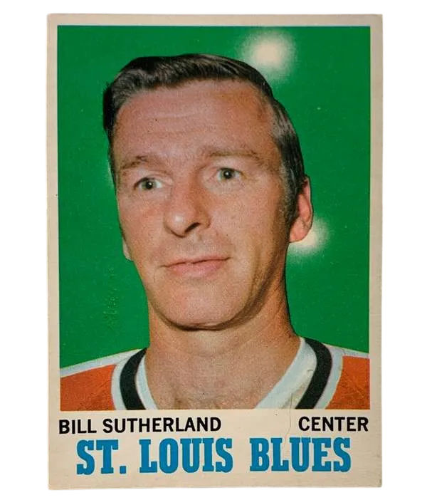 This #83 Bill Sutherland card from the iconic 1970-71 O-Pee-Chee set captures the veteran center during his tenure with the St. Louis Blues. Known as a reliable depth scorer and a traveler of the Original Six and early Expansion eras, Sutherland carved out a unique legacy in the NHL. He holds the prestigious distinction of scoring the first goal in Philadelphia Flyers franchise history—a lone marker that secured a 1-0 win over the Penguins in 1967.