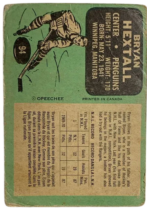 Step into the golden age of expansion-era hockey with this 1970-71 O-Pee-Chee Bryan Hextall #94. This card isn't just a piece of cardboard; it's a window into the storied Hextall hockey dynasty. Bryan Hextall Jr., the son of Hall of Famer Bryan Hextall Sr. and father to legendary goalie Ron Hextall, was a cornerstone of the early Pittsburgh Penguins. This card captures him in the classic baby blue Penguins uniform during his breakout years in the Steel City.