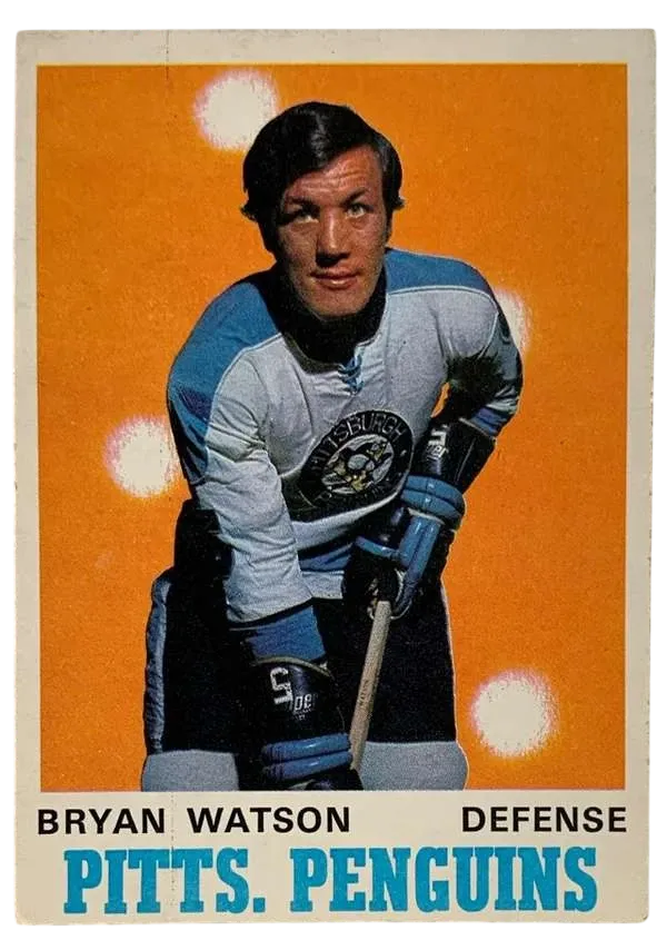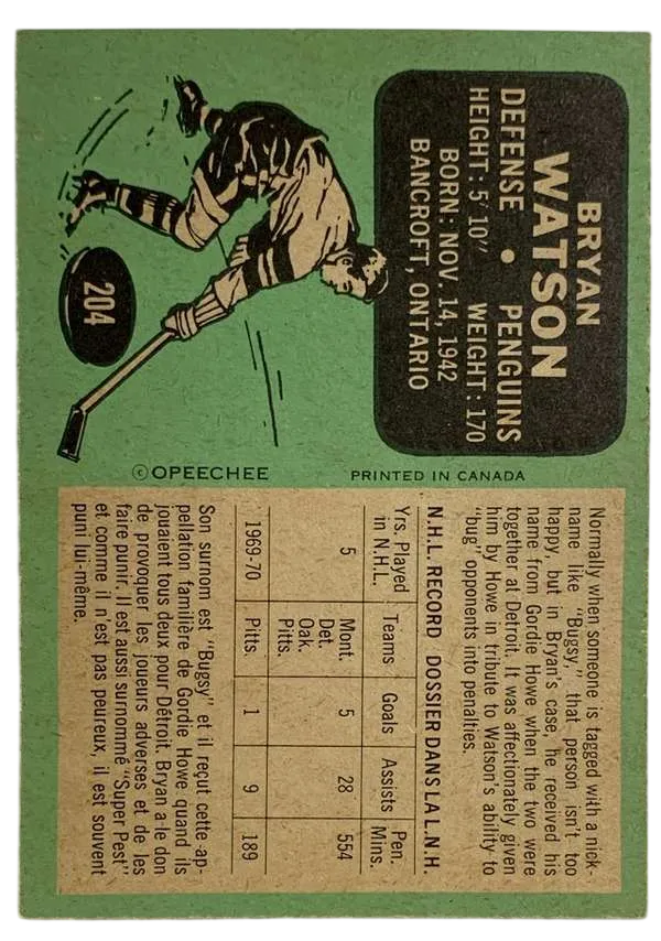 Step back into the "Golden Era" of hockey with this iconic 1970-71 O-Pee-Chee Bryan Watson #204 trading card. Bryan "Bugsy" Watson was one of the most feared and respected defensive enforcers of his time, famously known as the "Super Pest" for his ability to shadow and shut down legendary superstars like Bobby Hull and Gordie Howe. This card captures Watson in his prime with the Pittsburgh Penguins, featuring the vibrant orange background that has made the 1970-71 O-Pee-Chee set a favorite among vintage collectors.
