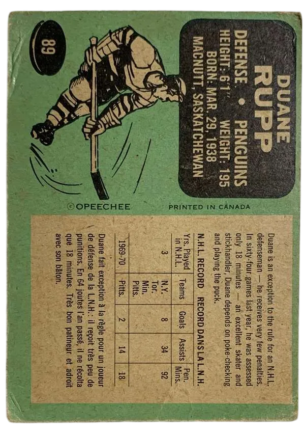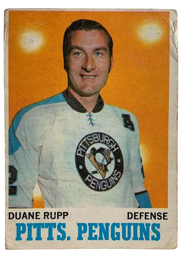 The 1970-71 O-Pee-Chee set is a favorite among vintage hockey collectors for its classic design and bilingual Canadian heritage. This card features the iconic O-Pee-Chee bilingual back, presenting player information and stats in both English and French. Duane Rupp, born in MacNutt, Saskatchewan, had a distinguished career that included a Memorial Cup win in 1957 and an NHL All-Star appearance in 1968. This card is an essential pick-up for Penguins team set builders or fans of 1970s NHL legends.