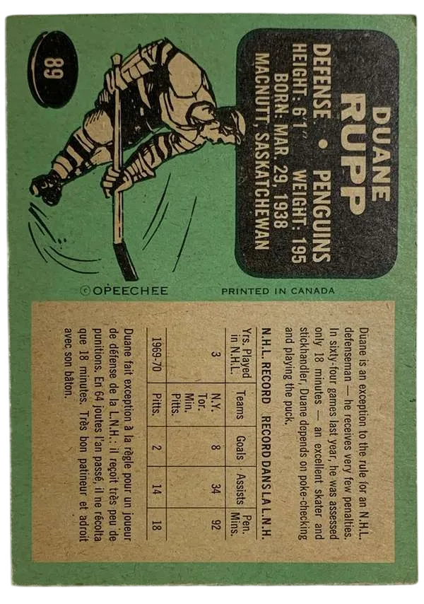 Whether you are a Penguins superfan or a vintage set builder, this 1970-71 O-Pee-Chee Duane Rupp #89 is an affordable way to own a piece of NHL history from a decade that defined the sport.