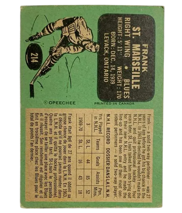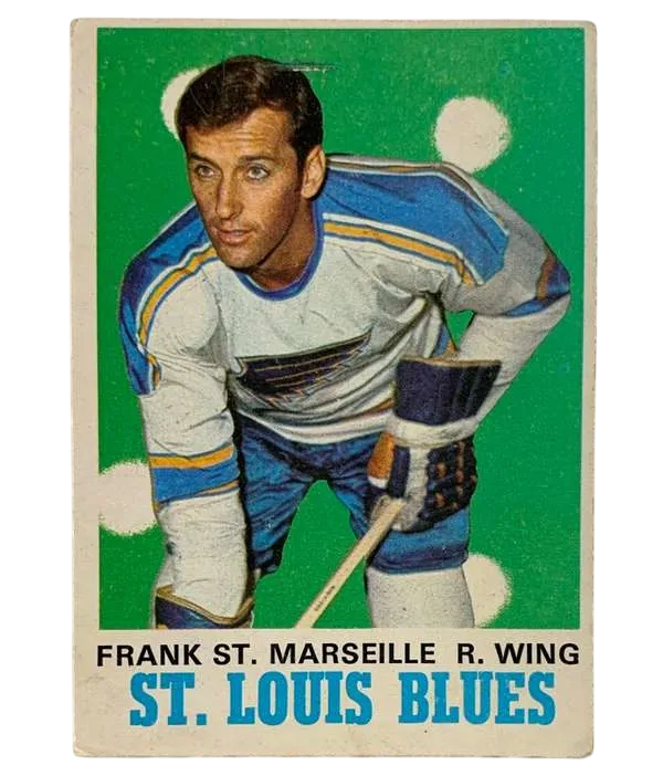 Frank St. Marseille carved out a remarkable NHL career after years of grinding through the minors. Joining the Blues at age 27, he immediately made an impact — scoring 20+ goals in each of his first two NHL seasons and becoming a consistent two‑way presence. Before reaching the NHL, he dominated the Western Hockey League as its leading scorer, a detail proudly highlighted on the card’s back. This issue comes from the iconic 1970‑71 O-Pee-Chee set, known for its bold green backgrounds, crisp player portraits, and the unmistakable bilingual English/French writeups that define Canadian-printed OPC heritage.