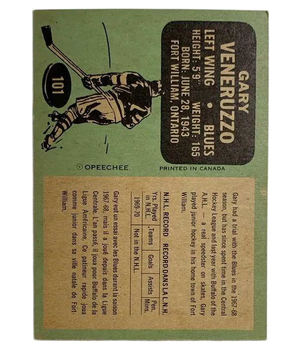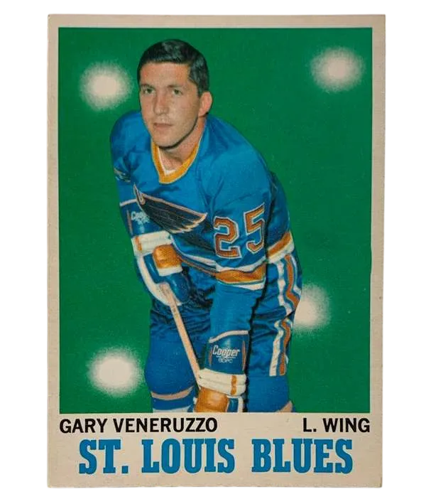 Step back into the golden era of the NHL with this authentic 1970-71 O-Pee-Chee Gary Veneruzzo #101 trading card. This stunning piece of hockey memorabilia captures Gary Veneruzzo during his tenure with the St. Louis Blues, a time when the "Expansion Era" was in full swing and the Blues were a dominant force in the West.