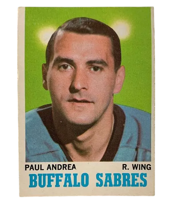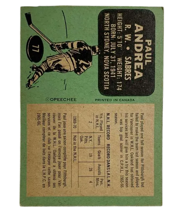 Own a piece of Buffalo Sabres history with this 1970-71 O-Pee-Chee Paul Andrea #77 rookie card. This vintage gem captures Andrea during his tenure with the Sabres, a season highlighted by his 19 goals and 28 assists. As a cornerstone of the legendary 1970 O-Pee-Chee hockey set, this card features the iconic green-bordered reverse with dual-language (English and French) player biographies and complete NHL statistical records.