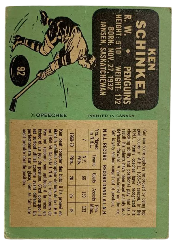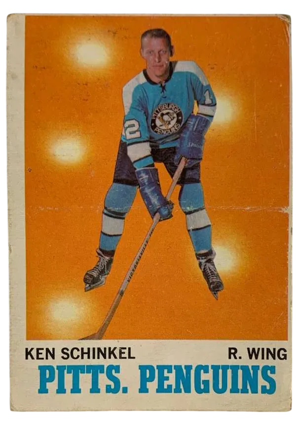 Step back into the "Golden Era" of NHL expansion with this 1969-70 O-Pee-Chee Ken Schinkel #117 card. As one of the original cornerstones of the Pittsburgh Penguins franchise, Ken Schinkel wasn't just a player; he was the first true star of the "Steel City" on ice. This vintage card captures Schinkel in the classic light blue and navy Penguins uniform, a look that has become legendary among hockey historians and jersey enthusiasts alike.
