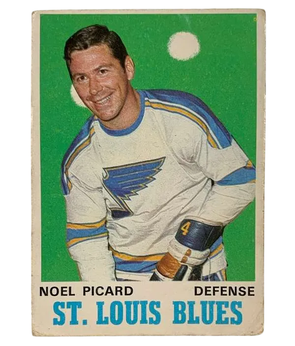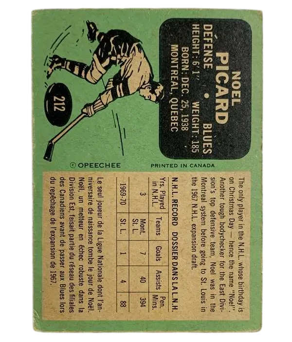 Capture the grit of the NHL's expansion era with this 1970-71 O-Pee-Chee Noel Picard #212. Noel Picard wasn't just any defenseman; he was a cornerstone of the original St. Louis Blues roster that took the league by storm in the late 1960s. This card comes from Picard's peak years in St. Louis, shortly after he famously shared the frame with Bobby Orr in one of the most celebrated photographs in sports history.