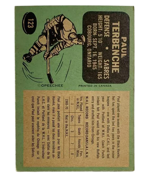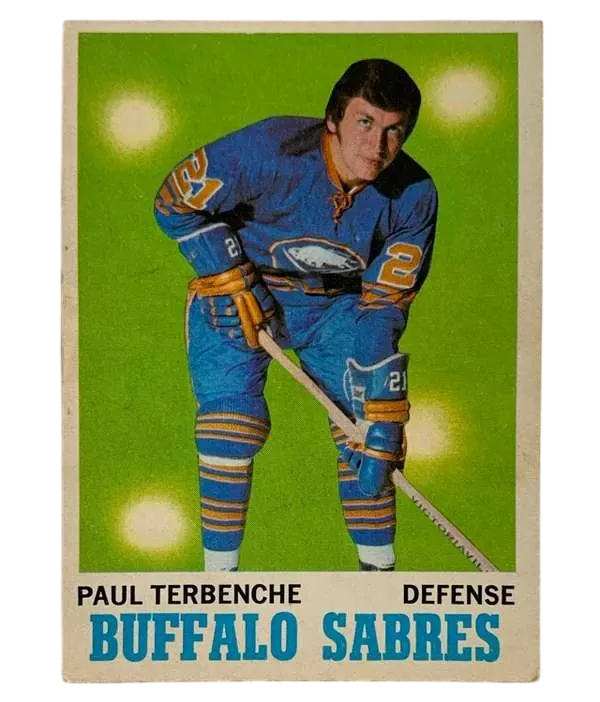Celebrate the birth of a franchise with this 1970-71 O-Pee-Chee Paul Terbenche rookie card. As card #123 in the legendary 1970-71 set, this item captures the Buffalo Sabres during their very first year in the NHL. Terbenche, a steady defenseman, was a key part of the Sabres' original roster, making this card a foundational piece for any Buffalo fan or vintage hockey collector.