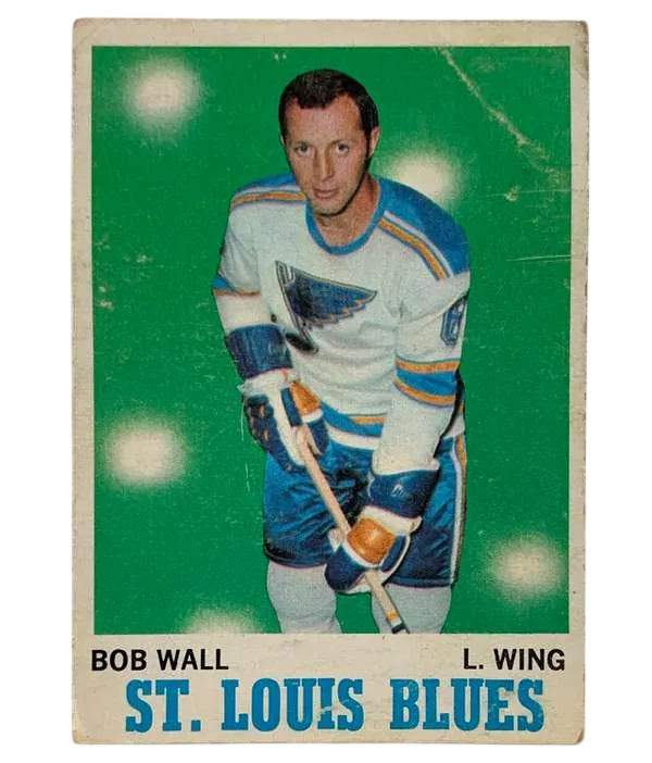 Add a piece of early‑expansion NHL history to your collection with this 1970 O-Pee-Chee Bob Wall #98, a classic vintage issue from one of the hobby’s most beloved Canadian-printed sets. Even in well‑worn condition, this card delivers strong collector appeal thanks to its bold green background, iconic OPC design, and representation of a versatile player who contributed meaningfully during the formative years of the Los Angeles Kings and St. Louis Blues. Bob Wall entered the league as a dependable two‑way skater, capable of playing both forward and defense — a rare flexibility that made him valuable to every roster he joined. After three seasons with the Los Angeles Kings, Wall was traded to the St. Louis Blues, where his defensive awareness and steady play helped solidify the team’s depth. His NHL totals — 47 goals, 142 assists, 189 points — reflect a player who carved out a respectable career during a gritty, physical era of hockey. This card features the unmistakable 1970 O-Pee-Chee aesthetic, including the bright green backdrop, bold team nameplate, and classic portrait photography. The reverse side showcases the bilingual O-Pee-Chee back, complete with a cartoon illustration, full NHL stats, and a short biography in both English and French — a signature characteristic of Canadian OPC production.