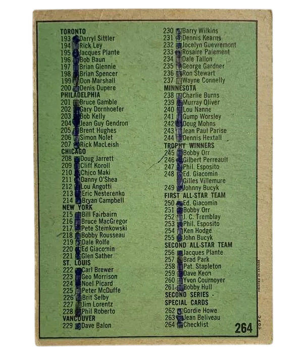 The 1971-72 O-Pee-Chee set is widely regarded as one of the "holy grails" of the early 70s due to its vibrant design and massive star power. This specific checklist covers a powerhouse era of hockey, listing legends such as Bobby Orr, Phil Esposito, Gordie Howe, and Jean Beliveau. Because checklists were intended to be used, finding "unmarked" copies is rare, making "marked" vintage examples like this a charming and affordable entry point for set builders.