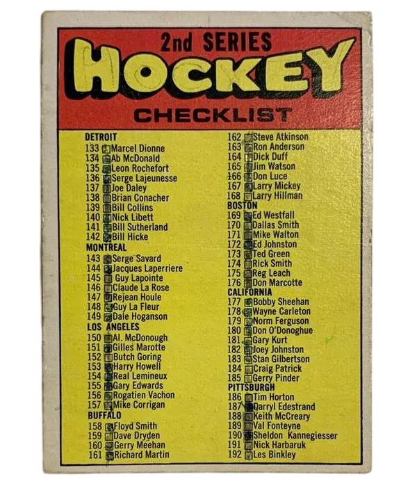 While a checklist doesn't feature a single player, this card serves as a directory of greatness. It indexes the "Trophy Winners," "First All-Star Team," and "Second All-Star Team" subsets, featuring names like Ken Hodge, John Bucyk, and Bobby Hull. It represents the pinnacle of the "Big Bad Bruins" era and the legendary Montreal Canadiens dynasty.