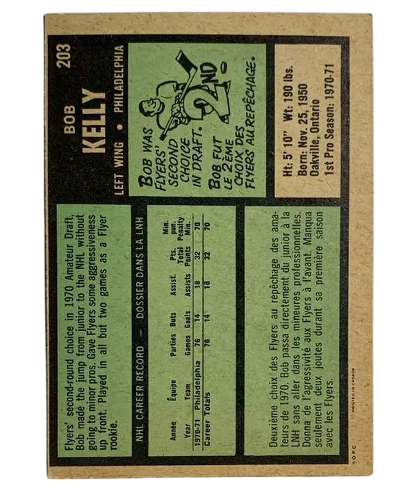 Step back into the golden age of the Broad Street Bullies with this authentic 1971-72 O-Pee-Chee Bob Kelly rookie card. Known to fans as "The Hound" for his relentless puck pursuit, Bob Kelly was a cornerstone of the Philadelphia Flyers' back-to-back Stanley Cup championships in 1974 and 1975. This specific card, #203 in the set, marks the first appearance of the legendary enforcer who would eventually score the Cup-clinching goal in 1975.