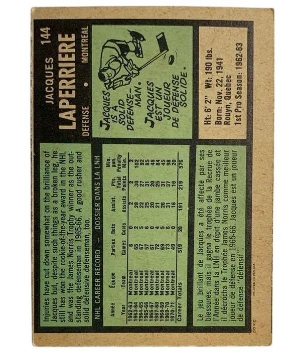 Secure a piece of Montreal Canadiens royalty with this vintage 1971-72 O-Pee-Chee Jacques Laperriere #144 card. Jacques Laperriere, a legendary Hall of Fame defenseman, was the backbone of the Canadiens' blueline for over a decade. Known for his "solid defense-man" playstyle—as noted on this card's unique bilingual back—Laperriere's career was a masterclass in defensive positioning and leadership.