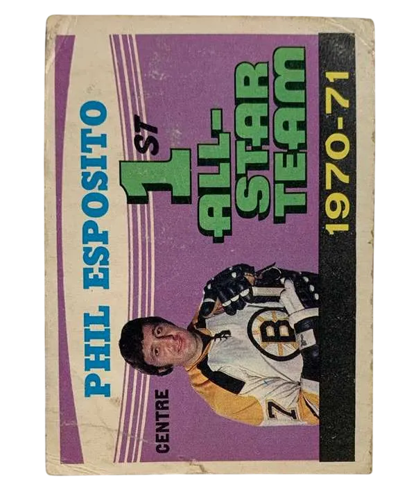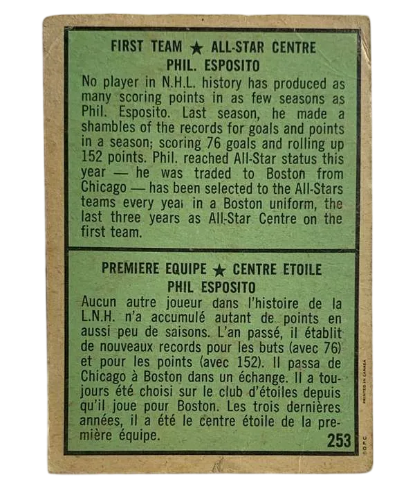 Relive the historic record-shattering dominance of "Espo" with this 1971-72 O-Pee-Chee Phil Esposito #253 All-Star tribute!