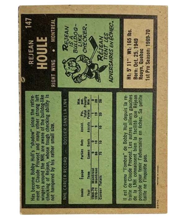 featuring Right Wing specialist, Rejean Houle. Known as one of the most tenacious "shadows" in the league, Houle’s career was defined by his incredible defensive work ethic and his critical role in the Canadiens' championship dynasty. This card captures Houle in his early prime, just after helping the Habs secure the 1971 Stanley Cup.