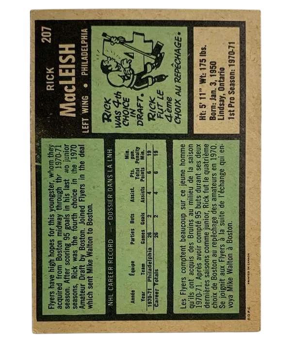 Step back into the gritty era of 1970s hockey with one of the most essential rookie cards of the decade. This 1971-72 O-Pee-Chee Rick MacLeish rookie card features the prolific forward who would become the heartbeat of the Philadelphia Flyers' back-to-back Stanley Cup championships. MacLeish wasn't just a part of the Broad Street Bullies; he was their offensive engine, famously scoring the Cup-clinching goal in 1974 against the Boston Bruins—the very team that traded him away before his debut.