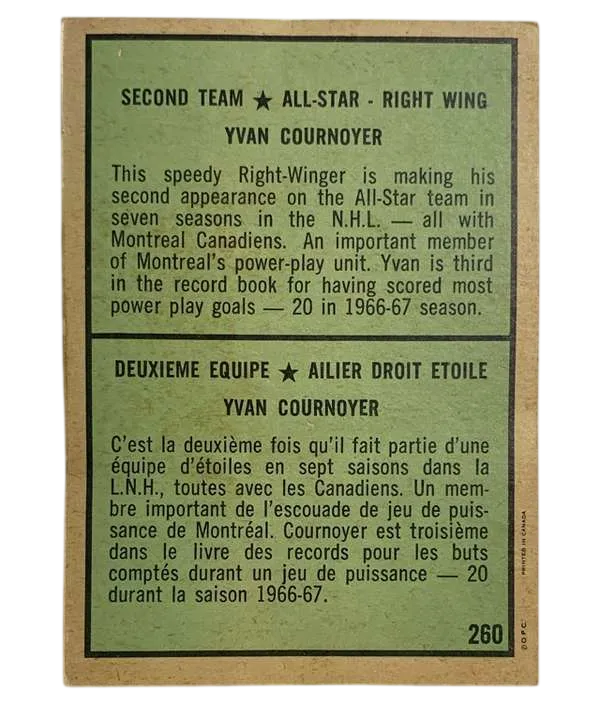 Capture a piece of "The Roadrunner's" legacy with this stunning 1971-72 O-Pee-Chee Yvan Cournoyer #260 All-Star card.
