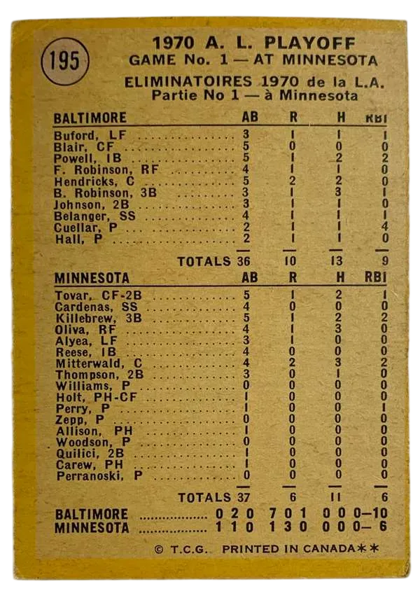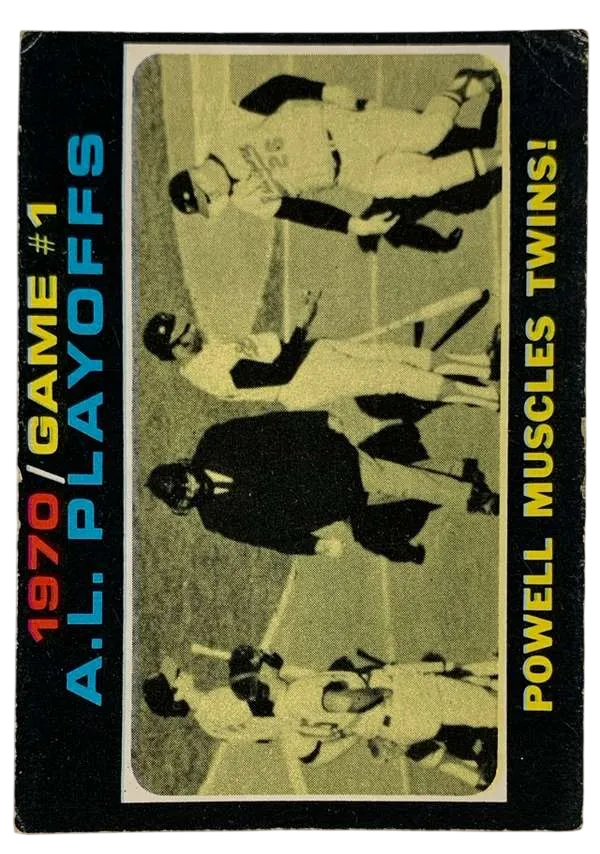 Relive the Baltimore Orioles' dominant march to the 1970 World Series with this iconic 1971 O-Pee-Chee #195 card. Titled "Powell Muscles Twins!", this card commemorates the Orioles' 10-6 victory in Game 1 of the American League Playoffs. It features a celebratory shot of slugger Boog Powell and teammates, capturing the raw energy of early 1970s playoff baseball. As an O-Pee-Chee (OPC) issue, this card is significantly scarcer than the standard Topps version, making it a high-priority "must-have" for vintage set builders and Orioles enthusiasts.