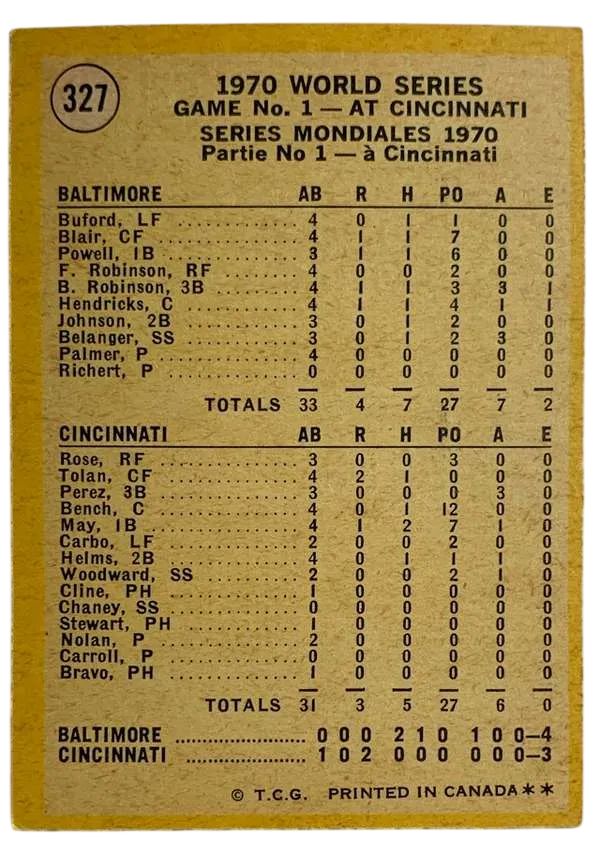 Add a legendary moment to your collection with this 1971 O-Pee-Chee #327 card, titled "Powell Homers to Opposite Field!". This card immortalizes a pivotal moment from Game 1 of the 1970 World Series, where Boog Powell's power was on full display against the Cincinnati Reds' "Big Red Machine." Finding 1971 O-Pee-Chee cards in this condition is a significant challenge due to the unforgiving black borders, making this a standout addition for any Alex Collect customer.