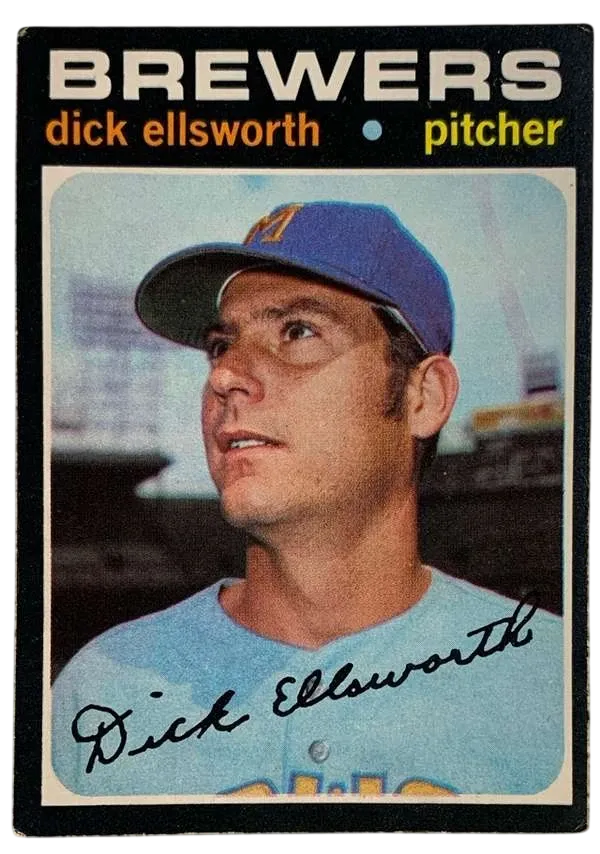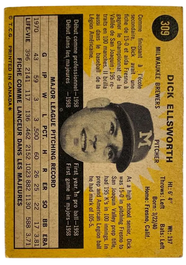 The 1971 O-Pee-Chee Dick Ellsworth #309 is a standout piece from one of the most notoriously difficult sets to collect in high grade. While the Topps version is common, this O-Pee-Chee edition was produced in much smaller quantities for the Canadian market, featuring the highly sought-after bilingual French/English back. For collectors of the "Brew Crew," this card captures Ellsworth during his final professional seasons, serving as a seasoned veteran for a young Milwaukee franchise.