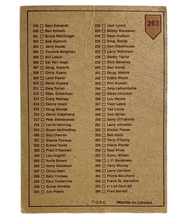 Complete your vintage hockey set with this 1974-75 O-Pee-Chee Hockey Checklist #263. This "List Card #2" covers key players and stars from the 1974-75 NHL season, including entries for legends like Terry O'Reilly, Gump Worsley, and Stan Gilbertson.