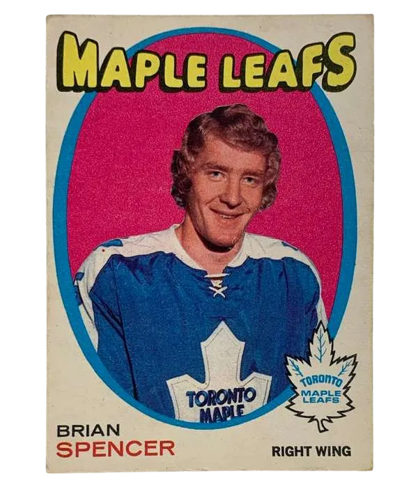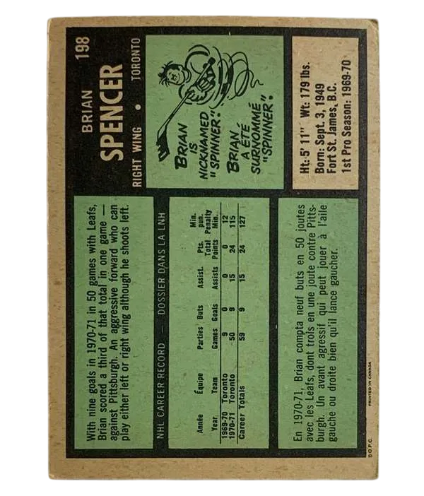 Delve into hockey history with the #198 Brian Spencer Rookie Card from the 1971-72 O-Pee-Chee set. This treasured piece features Brian "Spinner" Spencer of the Toronto Maple Leafs, captured during the dawn of his NHL career. A must-have for collectors and fans alike, the card is a genuine slice of sports heritage, manufactured in Canada during the vibrant era of modern ice hockey. The card's robust design showcases the detailed craftsmanship of the era and comes from a series well-regarded among enthusiasts. As an original issue, it has not been reprinted, ensuring its authenticity.