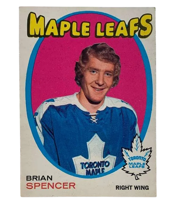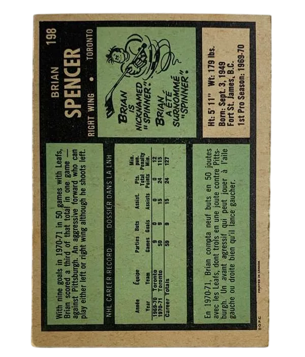 Delve into hockey history with the #198 Brian Spencer Rookie Card from the 1971-72 O-Pee-Chee set. This treasured piece features Brian "Spinner" Spencer of the Toronto Maple Leafs, captured during the dawn of his NHL career. A must-have for collectors and fans alike, the card is a genuine slice of sports heritage, manufactured in Canada during the vibrant era of modern ice hockey. The card's robust design showcases the detailed craftsmanship of the era and comes from a series well-regarded among enthusiasts. As an original issue, it has not been reprinted, ensuring its authenticity.Celebrate the legacy of a notable player and add a significant piece of the NHL's rich tapestry to your collection with this vintage sports trading card.