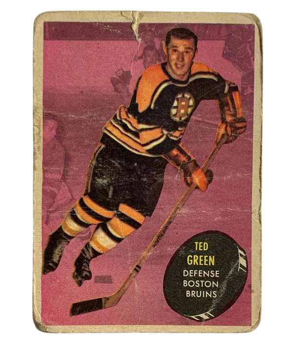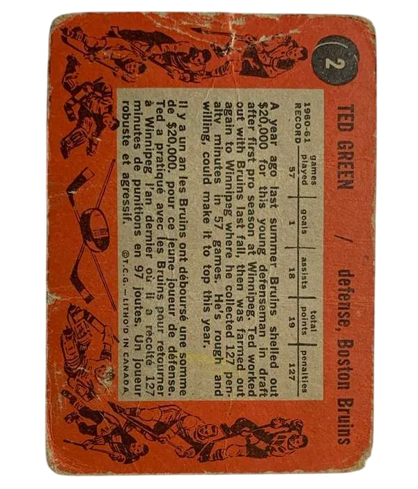 Experience a piece of hockey history with the #2 Ted Green 1961-62 Topps Hockey Card. Celebrating his rookie season, this vintage card is a must-have for enthusiasts and collectors. Featuring the iconic Boston Bruins player, it's a tangible connection to the golden era of the National Hockey League (NHL).